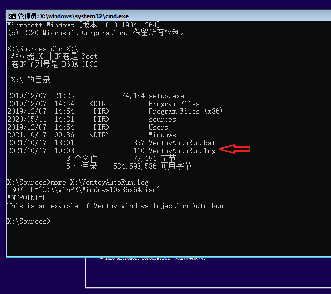 如果注入的文件中存在 X:\VentoyAutoRun.bat 文件,则会自动调用此脚本。