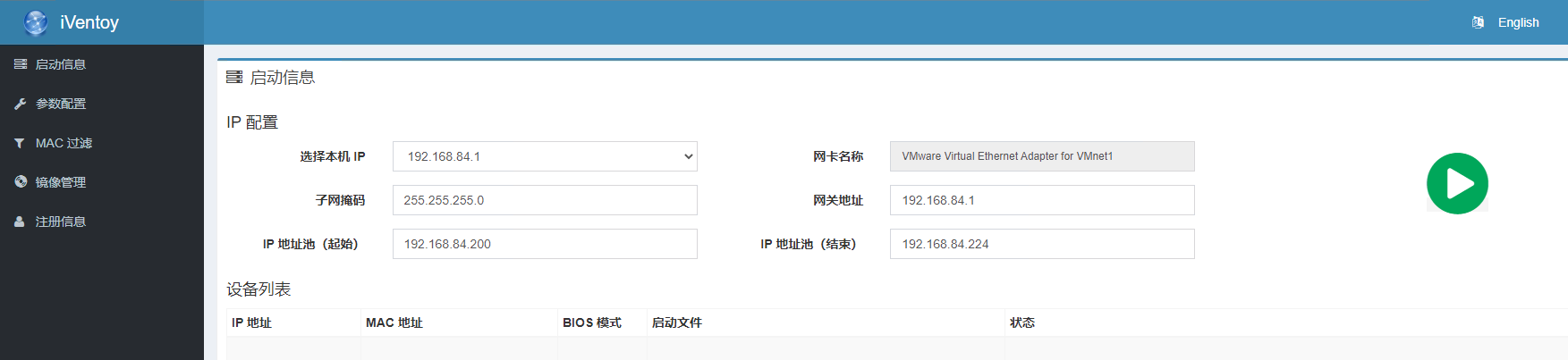 在 iVentoy 主界面上选择本机 IP 地址,设置好 IP 地址池,然后点击绿色的开始按钮即可。